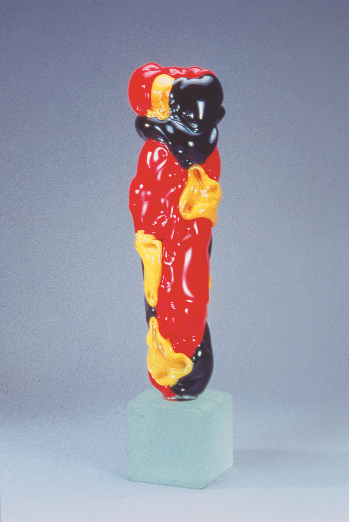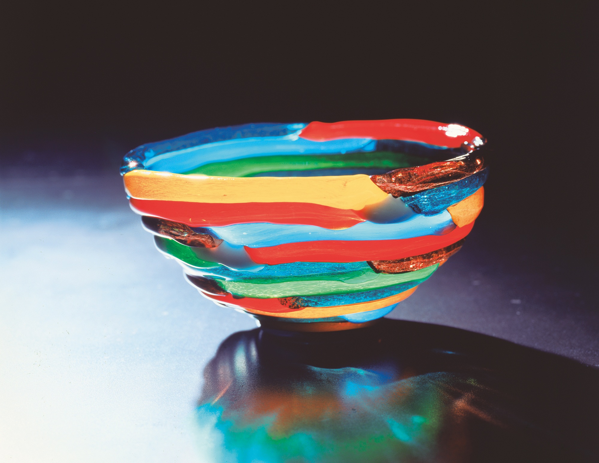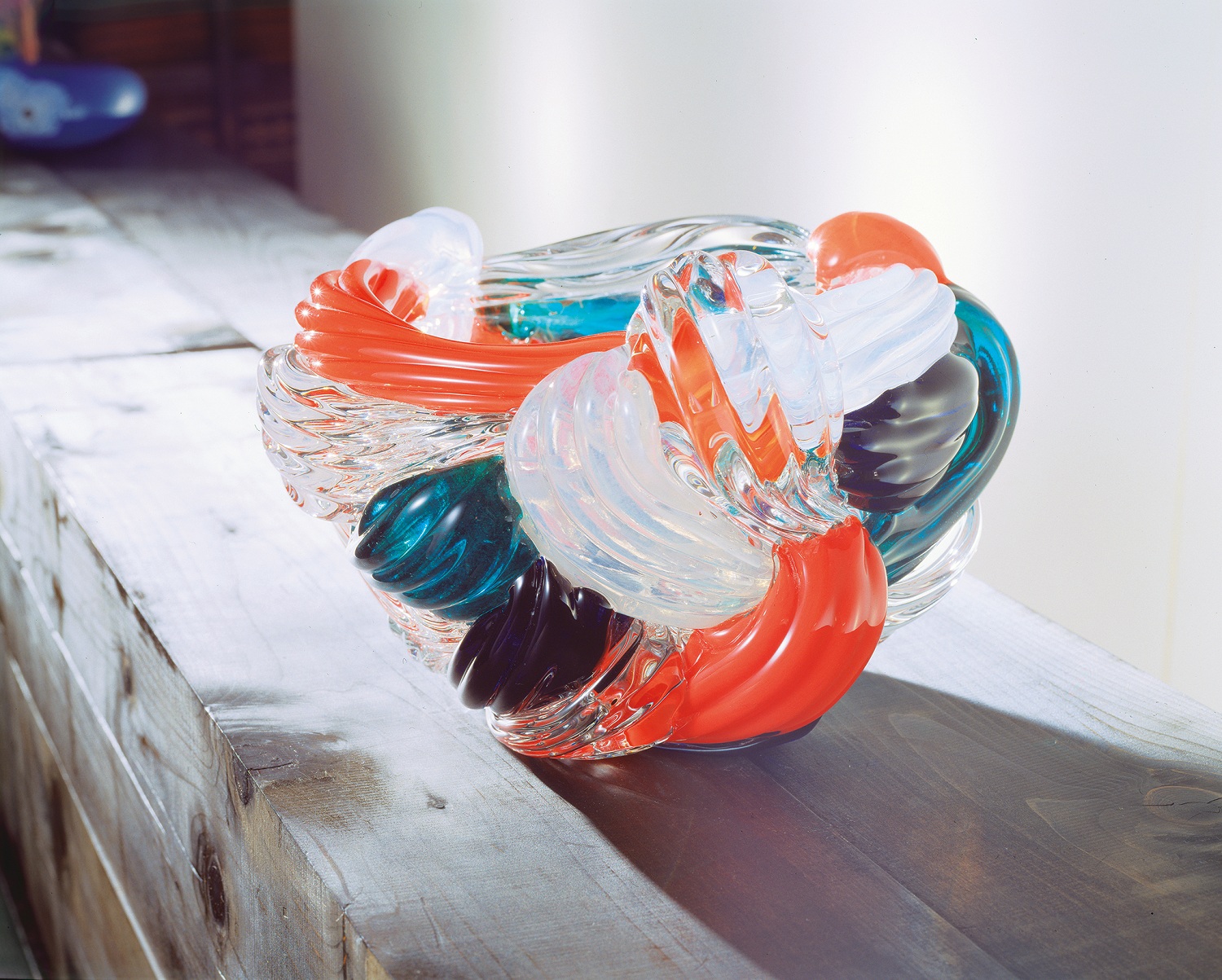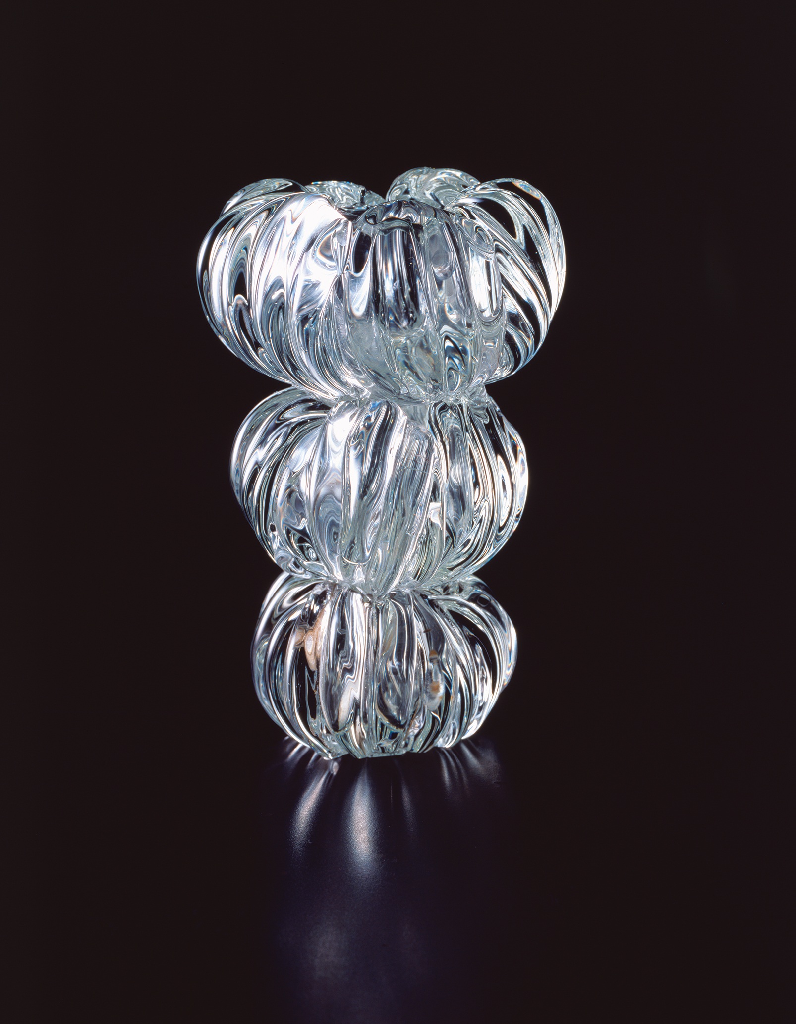 イワタルリの作品は、ガラスがそこに「在る」という存在感を大切にし、素材の特性や可能性を追究したものです。大きく二つのタイプに分けることができ、「立体作品」「工芸作品」と称されています。立体作品は、キャスト(鋳造)の技法による淡い緑色を帯びたガラスと、黒い鉄などの異素材とを組み合わせたものです。無駄を削ぎ落したガラスの塊は、力強く静謐な空間を生み出し、ガラスという素材が持つ可能性を示しています。工芸作品は宙吹きの技法を用いて作られ、自在な形と透明あるいは赤や黒といった鮮やかな色の肉厚の器で、豊かな量感がしなやかに空間と調和します。本展では、そうした創作の両面からイワタ芸術の造形世界の魅力を探ります。